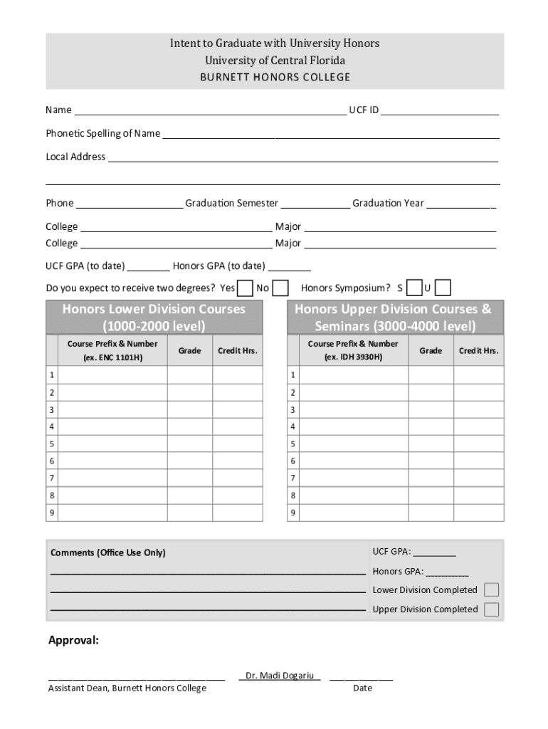 Intent to Graduate with University Honors University of Central Florida BURNETT HONORS COLLEGE Name ___ UCF ID ___ Phonetic Spelling of Name ___ Local Address ___ ___ Phone ___ Graduation Semester
