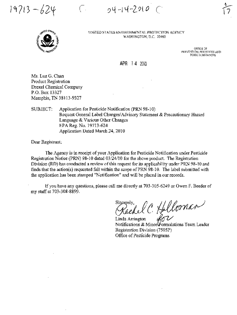 UNITED STATES ENVIRONMENTAL PROTECTION AGENCY WASHINGTON, D.C. 20460 OFFICE OF PREVENTION, PESTICIDES AND TOXIC SUBSTANCES APR 14 2010 Ms. Luz G. Chan Product Registration Drexel Chemical Company