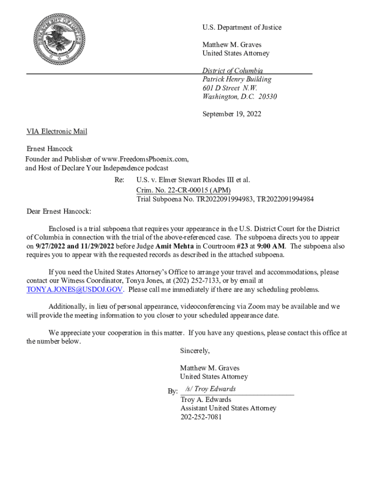 U.S. Department of Justice Matthew M. Graves United States Attorney District of Columbia Patrick Henry Building 601 D Street N.W. Washington, D.C. 20530 September 19, 2022, VIA Electronic Mail Ernest