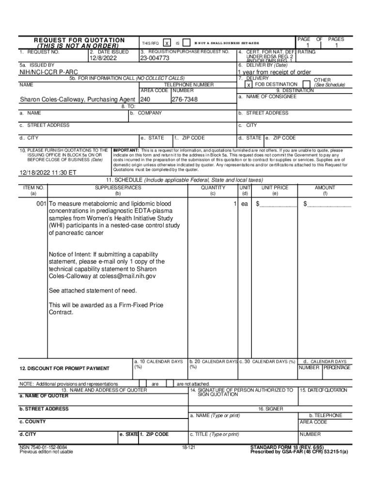 Posting Date: December 8, 2022, Closing Date: December 18, 2022, 11:30 a.m. ET Reference Number: 23004773 To: NCI Bid Board From: Sharon ColesCalloway NCI DCE Purchasing Agent coless@mail.nih.govSubject: