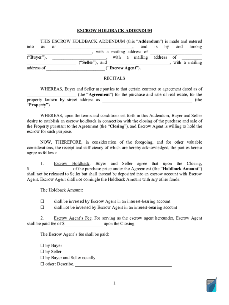 Obtain the escrow holdback addendum form from your real estate agent or attorney.