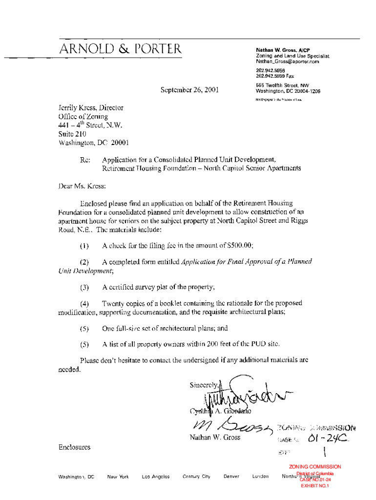 ARNOLD & PORTER Nathan W. Gross, ICP Zoning and Land Use Specialist Nathan_Gross@aporter.com 202.942.5956 202.942.5999 Fax 555 Twelfth Street, NW Washington, DC 200041206September 26, 2001Not Engaged