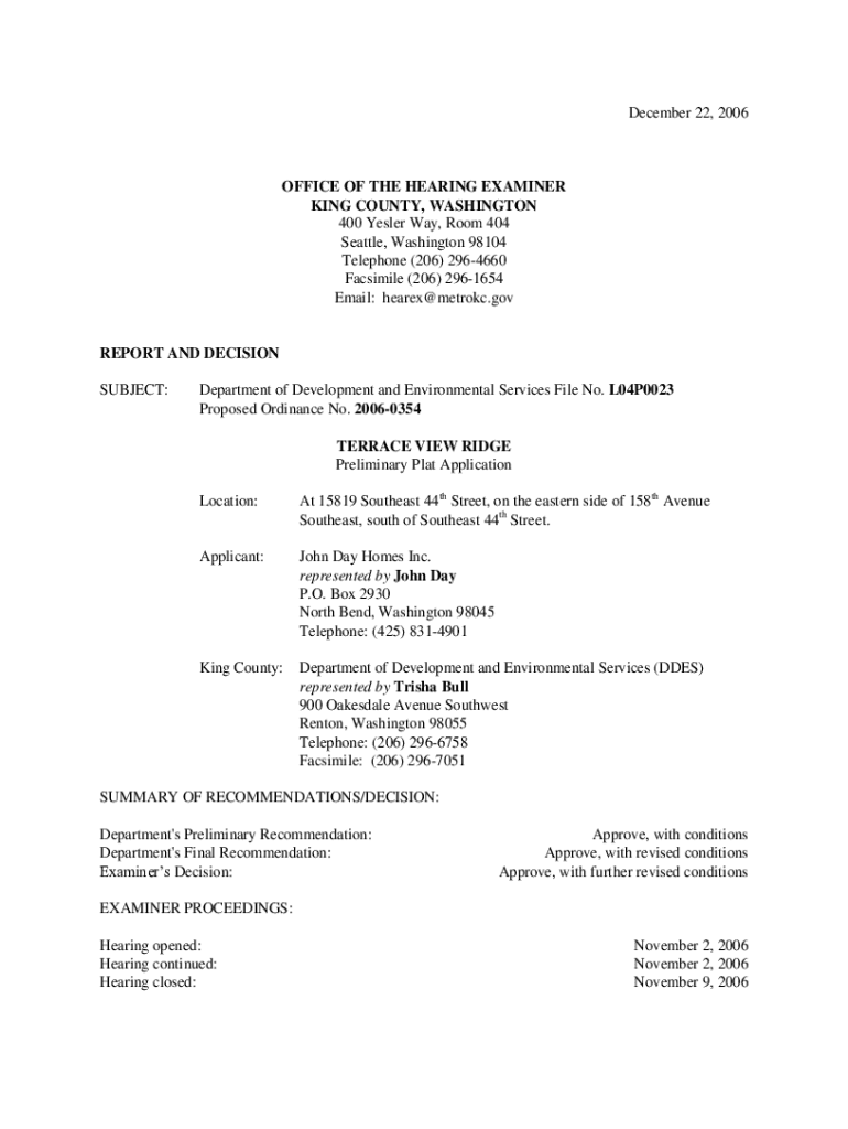 December 22, 2006OFFICE OF THE HEARING EXAMINER KING COUNTY, WASHINGTON 400 Lesser Way, Room 404 Seattle, Washington 98104 Telephone (206) 2964660 Facsimile (206) 2961654 Email: hearex@metrokc.govREPORT