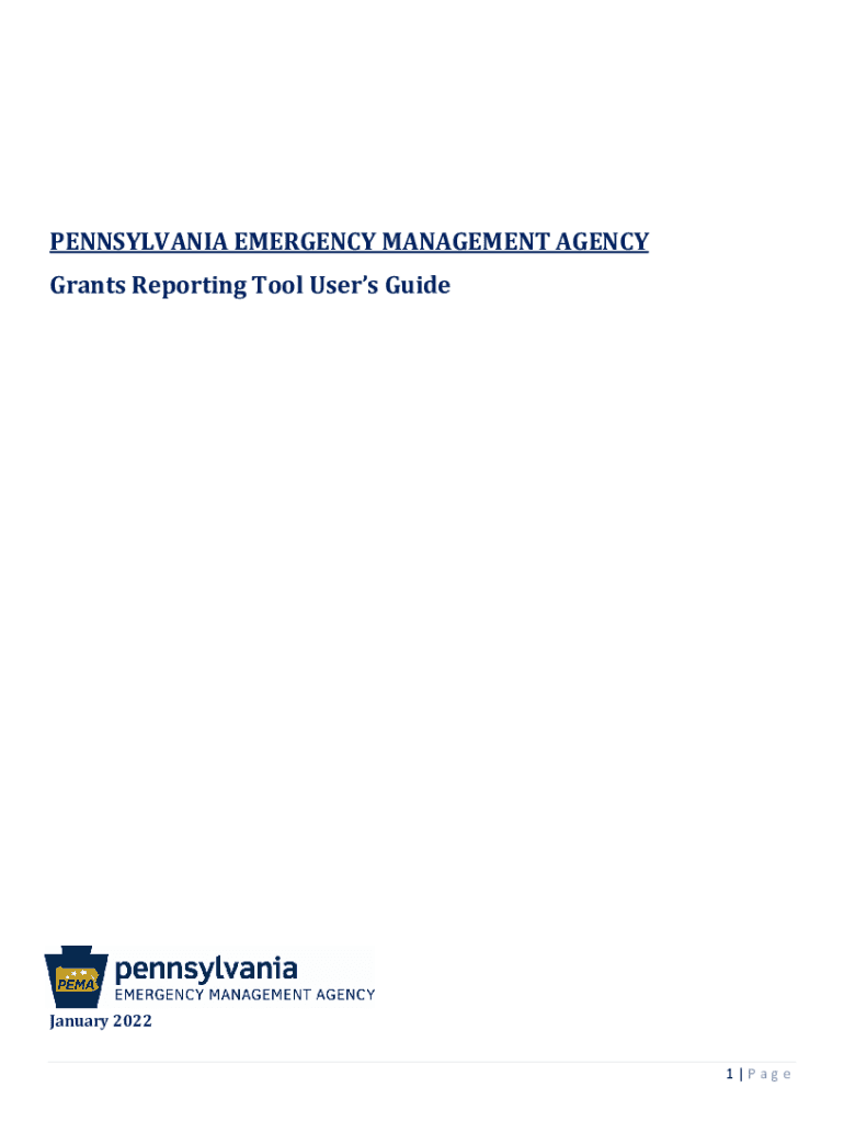 PENNSYLVANIA EMERGENCY MANAGEMENT AGENCY Grants Reporting Tool Users Guide January 2022 1|PageFEMA System Purpose The Federal Emergency Management Agency (FEMA) continues to improve its grant distribution