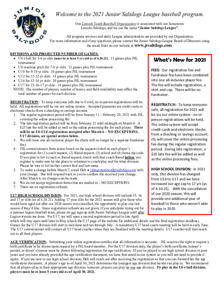 Welcome to the 2021 Junior Salt dogs League baseball program. Our Lincoln Youth Baseball Organization is associated with our hometown Lincoln Salt dogs, and we use the name Junior Salt dogs League.