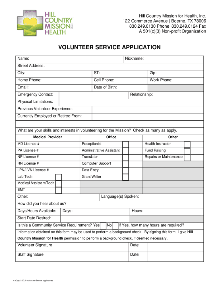 Hill Country Mission for Health, Inc. 122 Commerce Avenue | Borne, TX 78006 830.249.0130 Phone |830.249.0124 Fax A 501(c)(3) Nonprofit OrganizationVOLUNTEER SERVICE APPLICATION Name:Nickname:Street