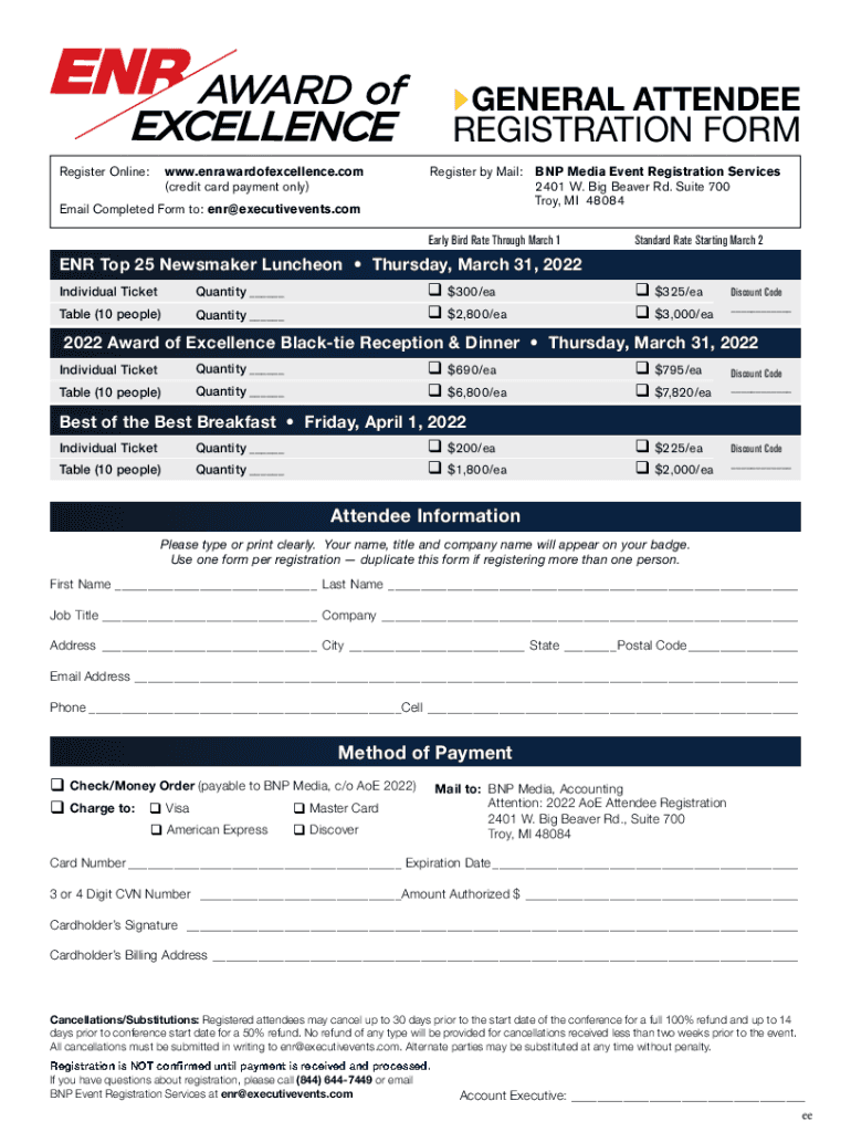 GENERAL ATTENDEEREGISTRATION FORM Register Online:www.enrawardofexcellence.com (credit card payment only) Email Completed Form to: enr@executivevents.comRegister by Mail:BNP Media Event Registration