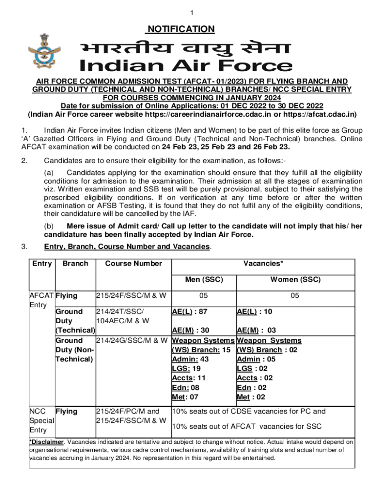 1NOTIFICATIONAIR FORCE COMMON ADMISSION TEST (ACAT 01/2023) FOR FLYING BRANCH AND GROUND DUTY (TECHNICAL AND NONTECHNICAL) BRANCHES/ NCC SPECIAL ENTRY FOR COURSES COMMENCING IN JANUARY 2024 Date for