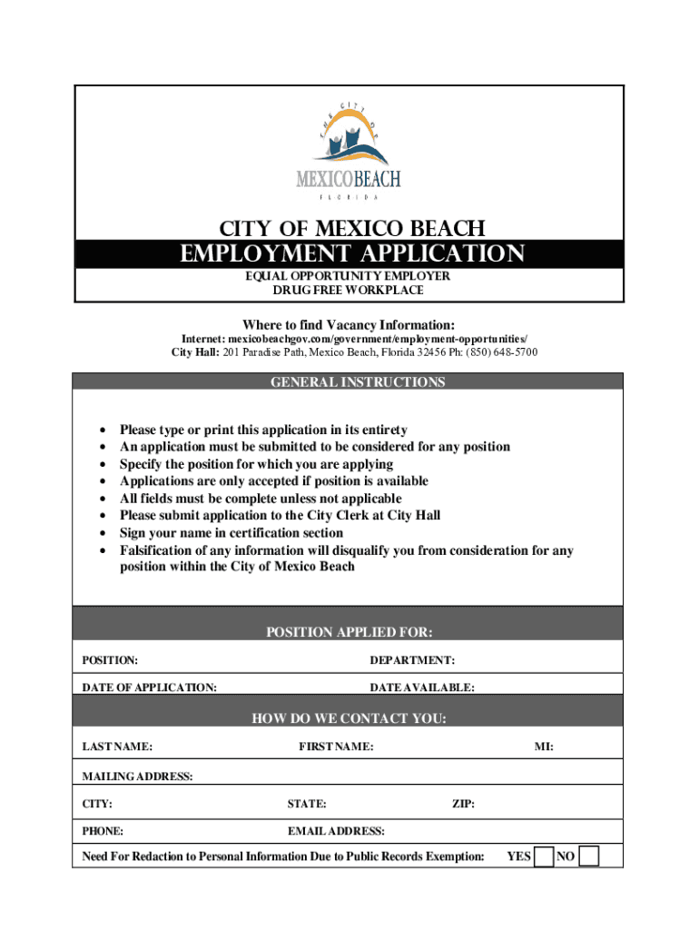 CITY OF Mexico beachEMPLOYMENT APPLICATION EQUAL OPPORTUNITY EMPLOYER DRUG FREE WORKPLACEWhere to find Vacancy Information:Internet: mexicobeachgov.com/government/employmentopportunities/ City Hall: