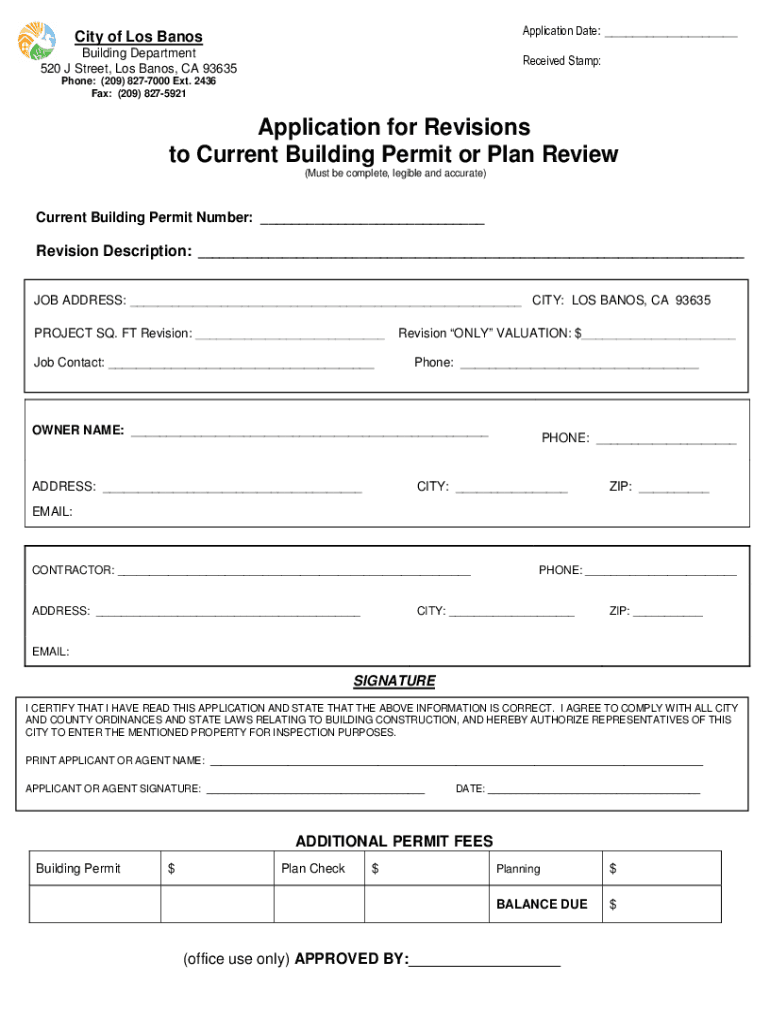 Application Date: ___City of Los Bands Building Department 520 J Street, Los Bands, CA 93635Received Stamp:Phone: (209) 8277000 Ext. 2436 Fax: (209) 8275921Application for Revisions to Current Building