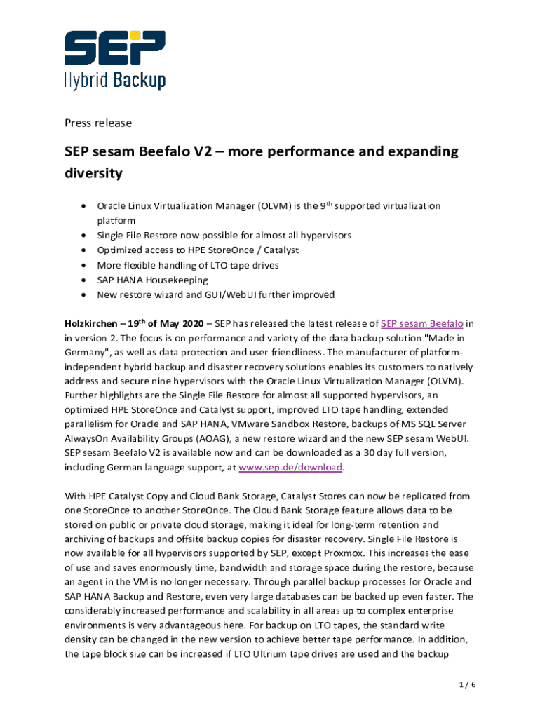 Press release SEP seam Buffalo V2 more performance and expanding diversity Oracle Linux Virtualization Manager (LLVM) is the 9th supported virtualization platform Single File Restore now possible