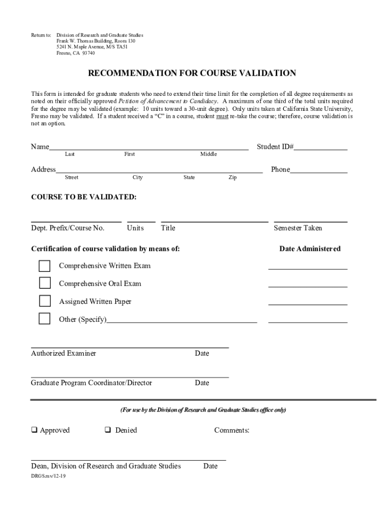 Guidelines for the Completion of the Recommendation for Course Validation Form This information is provided to assist you in the completion of the Recommendation for Course Validation form. Your first