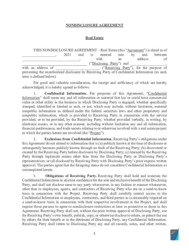 NONDISCLOSURE AGREEMENT Real Estate THIS NONDISCLOSURE AGREEMENT Real Estate (this Agreement) is dated as of ___, 2021 and is entered into by and between ___, with an address of ___ (Disclosing Party)