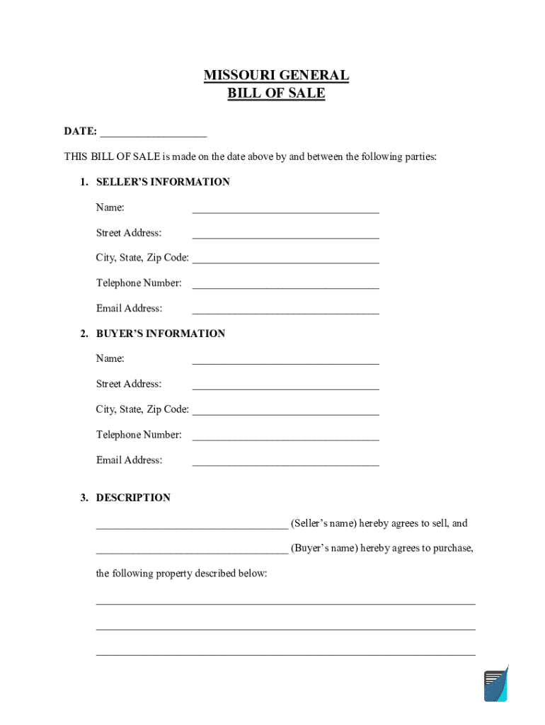 MISSOURI GENERAL BILL OF SALE DATE: ___ THIS BILL OF SALE is made on the date above by and between the following parties: 1. SELLERS INFORMATION Name:___Street Address:___City, State, Zip Code: ___
