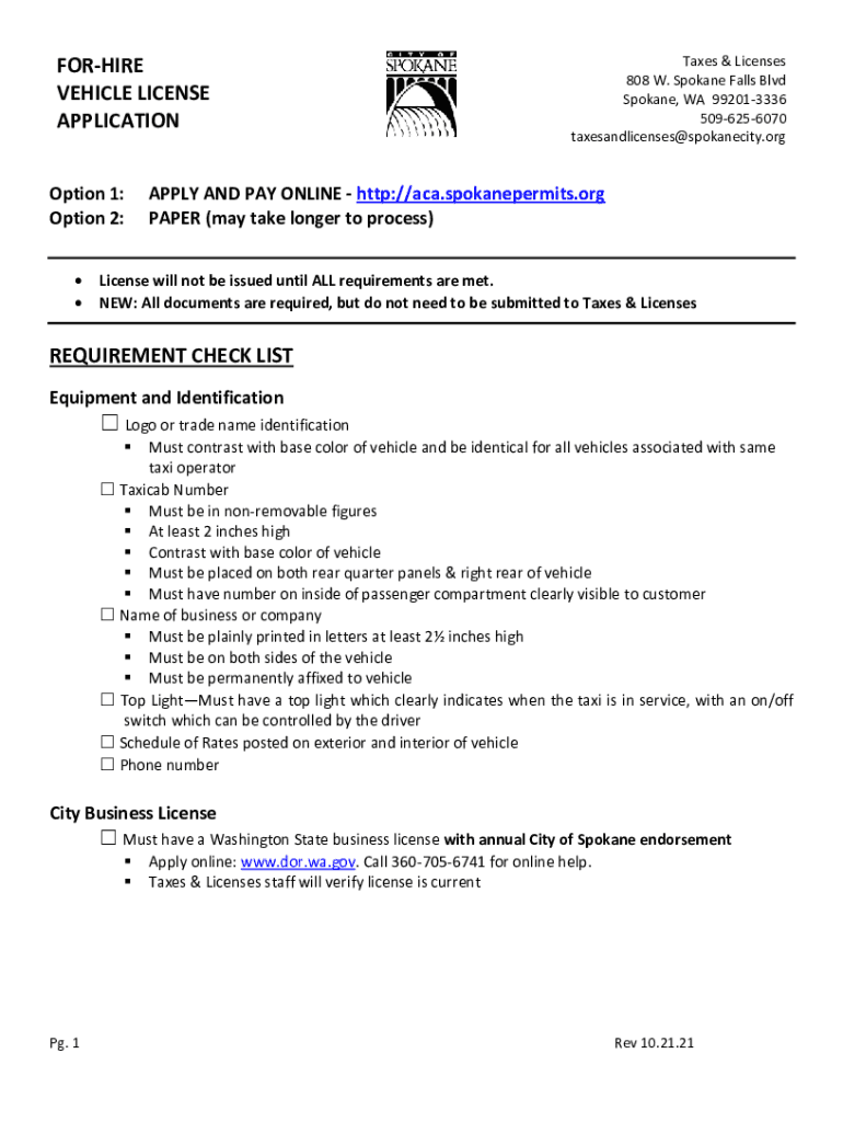 FORGIVE VEHICLE LICENSE APPLICATION Option 1: Option 2: Taxes & Licenses 808 W. Spokane Falls Blvd Spokane, WA 992013336 5096256070 taxesandlicenses@spokanecity.orgAPPLY AND PAY ONLINE http://aca.spokanepermits.org