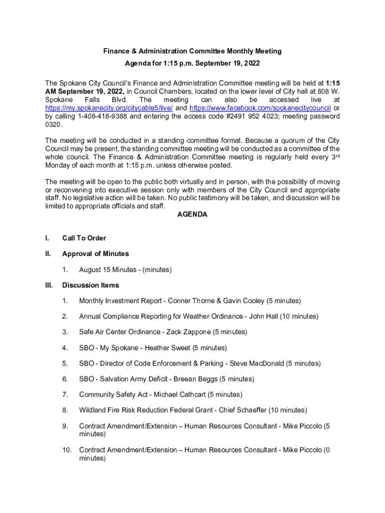Finance & Administration Committee Monthly Meeting Agenda for 1:15 p.m. September 19, 2022, The Spokane City Councils Finance and Administration Committee meeting will be held at 1:15 AM September