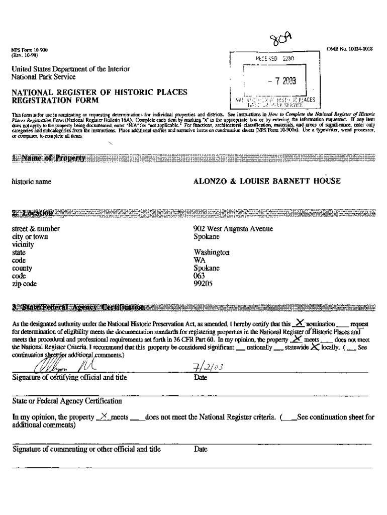 OMB No. 100240018NFS Form 10900 (Rev. 1090)RECEIVEDUnited States Department of the Interior National Park Service2280 1 2003 i_.........NATIONAL REGISTER OF HISTORIC PLACES REGISTRATION FORMAT, RFC’S