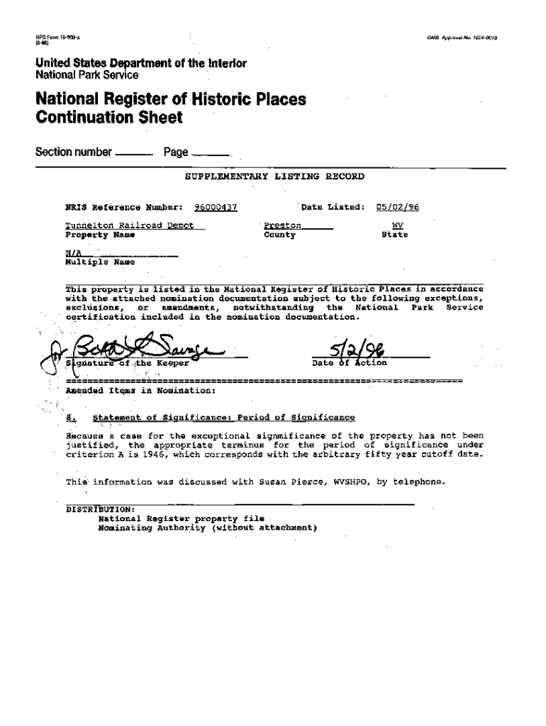 NPS Form 10900a (886)OMB Approval No. 10240018United States Department of the Interior National Park ServiceSection number Pagers Reference Number:96000437Tunnelton Railroad Depot Property Name Date