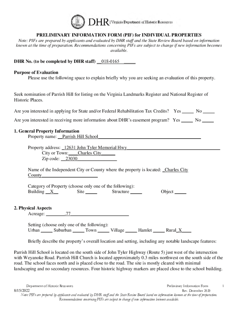 PRELIMINARY INFORMATION FORM (PIF) for INDIVIDUAL PROPERTIES Note: Pigs are prepared by applicants and evaluated by DHR staff and the State Review Board based on information known at the time of preparation.