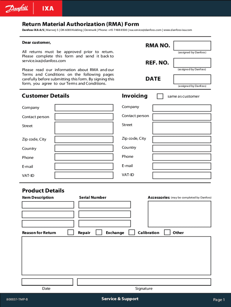 Return Material Authorization (RMA) Form Danfoss IRA A/S | Marshes 5 | DK6000 Holding | Denmark | Phone: +45 7488 8500 | ixa.service@danfoss.com | www.danfossixa.comDear customer, RMA NO. All returns