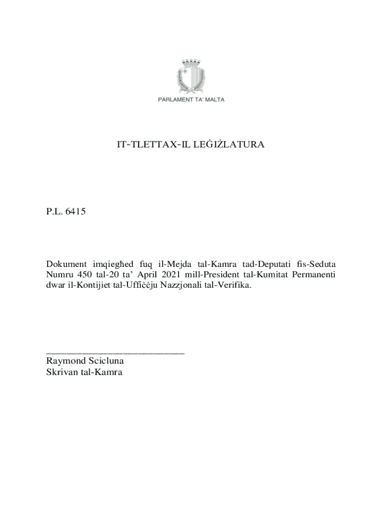 ITTLETTAXIL LEILATURAP. L. 6415Dokument impaired fun Imelda Ankara tadDeputati fisSeduta Guru 450 tal20 ta April 2021 millPresident talKumitat Permanent war ilKontijiet talUffiju Nazzjonali talVerifika.___
