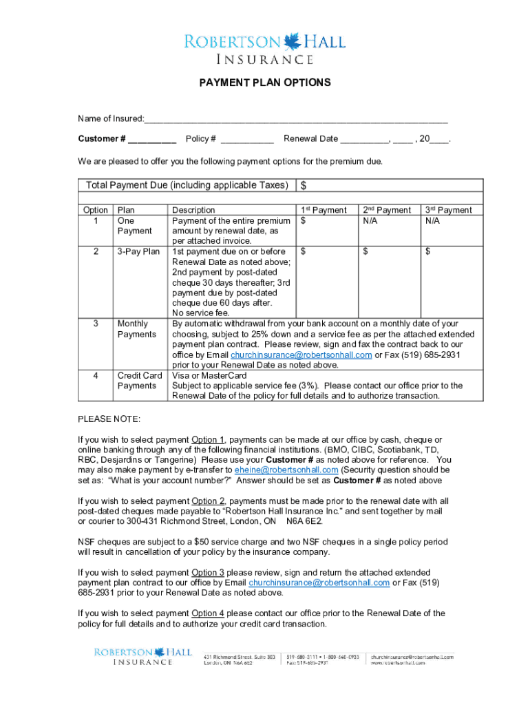 PAYMENT PLAN OPTIONS Name of Insured:___ Customer # ___Policy # ___Renewal Date ___, ___, 20___. We are pleased to offer you the following payment options for the premium due. Total Payment Due (including