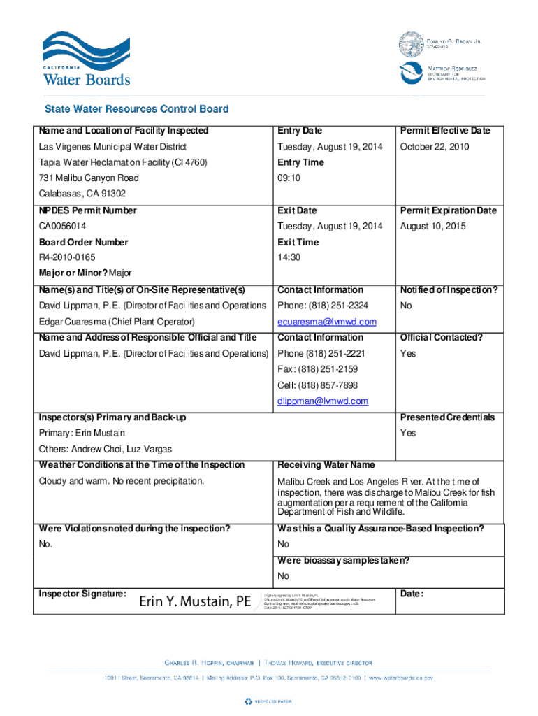 Name and Location of Facility InspectedEntry DatePermit Effective Date Las Diogenes Municipal Water District Tuesday, August 19, 2014October 22, 2010Tapia Water Reclamation Facility (CI 4760)Entry
