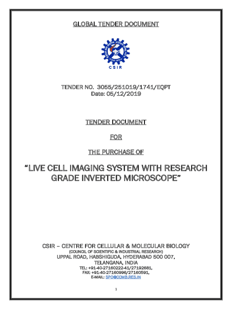 GLOBAL TENDER DOCUMENTTENDER NO. 3055/251019/1741/EPT Date: 05/12/2019TENDER DOCUMENT FOR THE PURCHASE OLIVE CELL IMAGING SYSTEM WITH RESEARCH GRADE INVERTED MICROSCOPES Center FOR CELLULAR & MOLECULAR