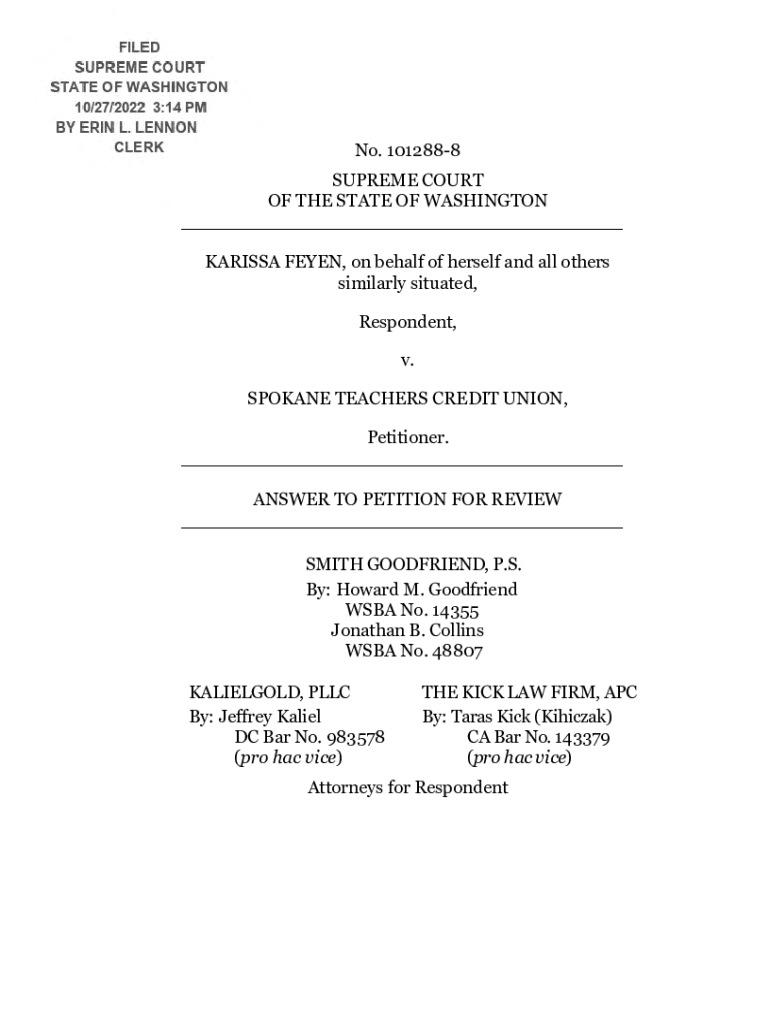 FILED SUPREME COURT STATE OF WASHINGTON 10/27/2022 3:14 PM BY ERIN L. LENNON CLERK No. 1012888SUPREME COURT OF THE STATE OF WASHINGTON ___ CARISSA FEY EN, on behalf of herself and all others similarly