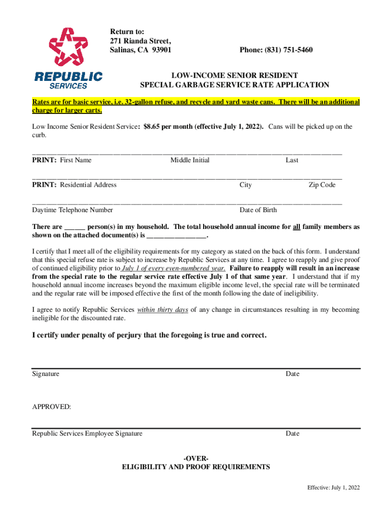 Return to: 271 Rwanda Street, Salinas, CA 93901Phone: (831) 7515460LOWINCOME SENIOR RESIDENT SPECIAL GARBAGE SERVICE RATE APPLICATION Rates are for basic service, i.e. 32gallon refuse, and recycle