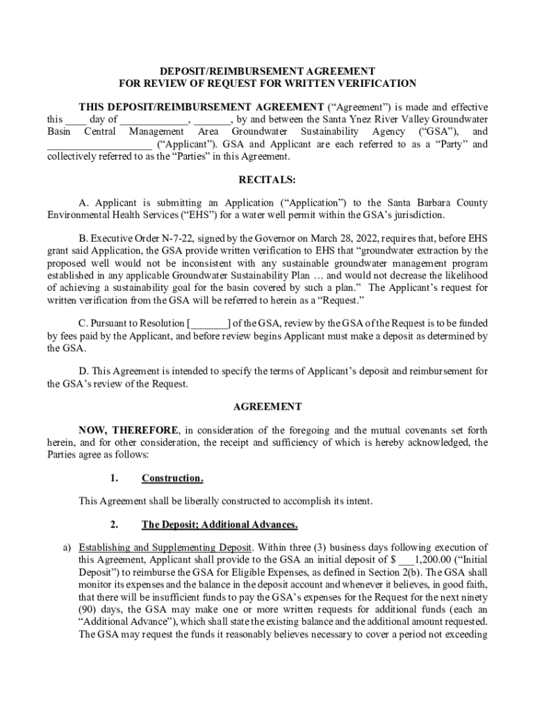 DEPOSIT/REIMBURSEMENT AGREEMENT FOR REVIEW OF REQUEST FOR WRITTEN VERIFICATION THIS DEPOSIT/REIMBURSEMENT AGREEMENT (Agreement) is made and effective this ___ day of ___, ___, by and between the Santa