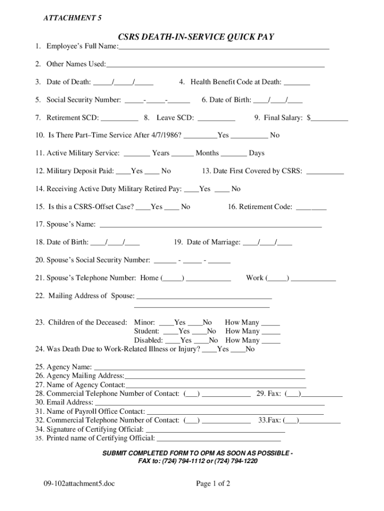 Get the free CSRS DEATH-IN-SERVICE QUICK PAY 1. - United States Office of Personnel ...