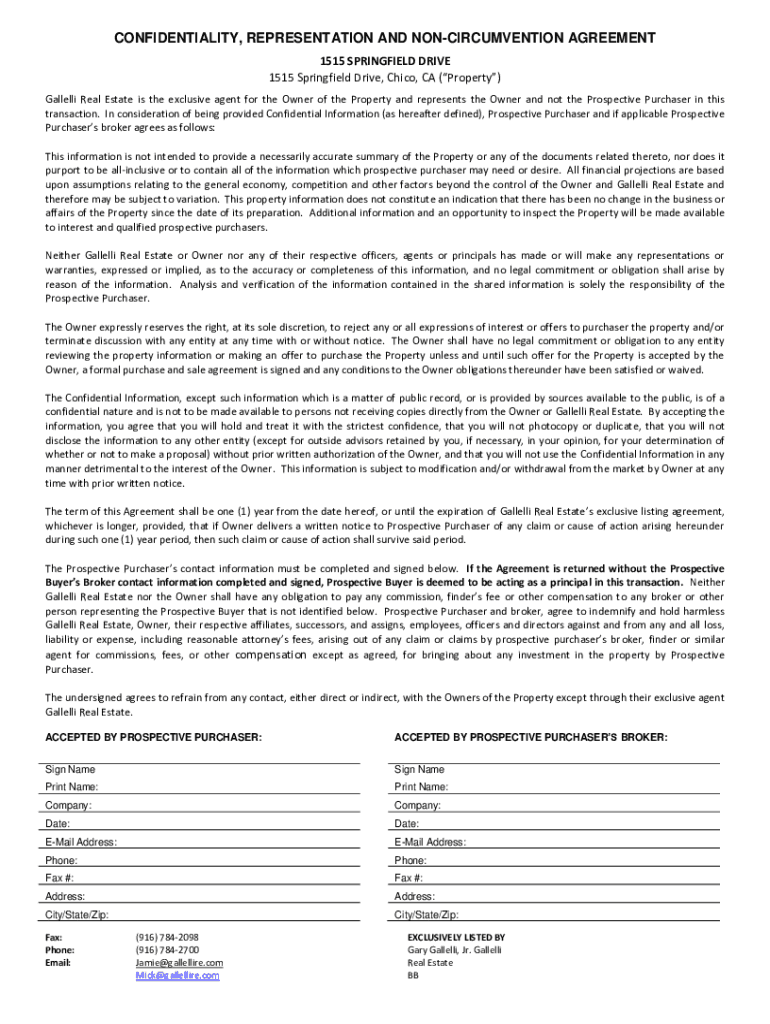 CONFIDENTIALITY, REPRESENTATION AND CIRCUMVENTION AGREEMENT 1515 SPRINGFIELD DRIVE 1515 Springfield Drive, Chico, CA (Property) Malleoli Real Estate is the exclusive agent for the Owner of the Property