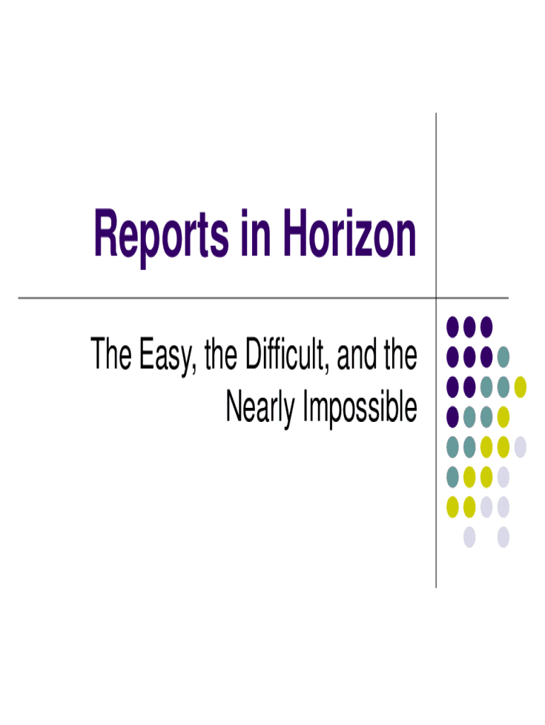Reports in Horizon The Easy, the Difficult, and the Nearly Impossibles Reports Item Report and Table Editor can answer many quick questions. For example: How many borrowers do I have? How many borrowers?