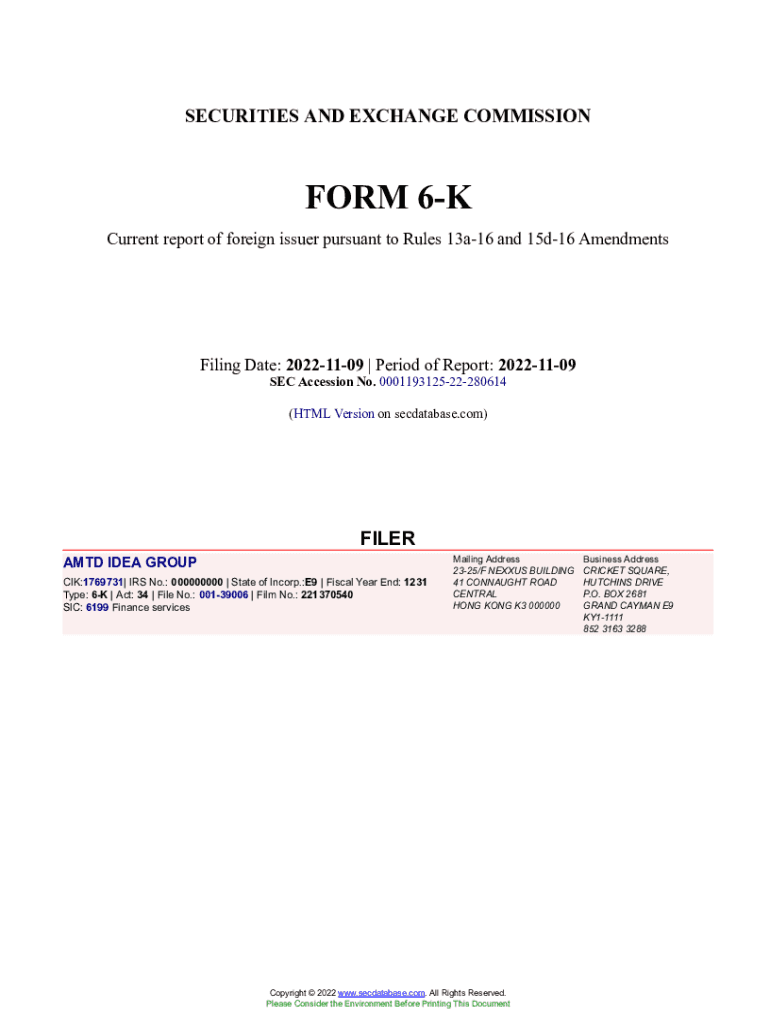 Get the free AMTD IDEA GROUP Form 6-K Current Event Report Filed 2022-11-09. Accession Number