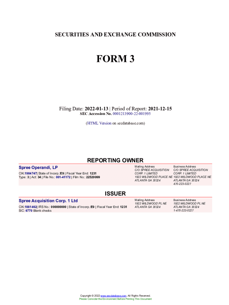 SECURITIES AND EXCHANGE COMMISSIONER 3Filing Date: 20220113 | Period of Report: 20211215 SEC Accession No. 000121390022001995 (HTML Version on secdatabase.com)REPORTING OWNER Spree Operand, LP CIK:1904747|