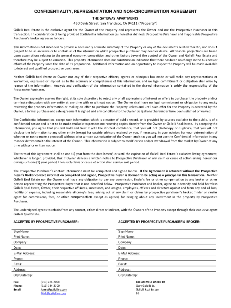 CONFIDENTIALITY, REPRESENTATION AND CIRCUMVENTION AGREEMENT THE GATEWAY APARTMENTS 460 Davis Street, San Francisco, CA 94111 (Property) Malleoli Real Estate is the exclusive agent for the Owner of