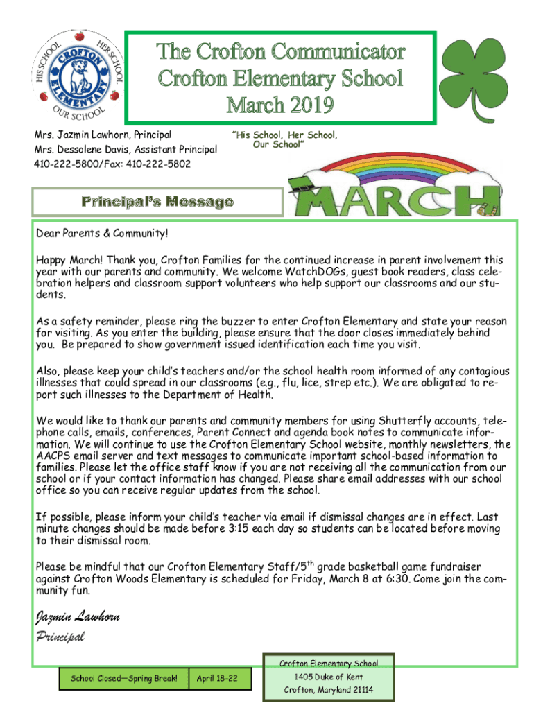 The Crofton Communicator Crofton Elementary School March 2019 Mrs. Jazmin Law horn, Principal Mrs. Dissolve Davis, Assistant Principals School, Her School, Our School4102225800/Fax: 4102225802Principals