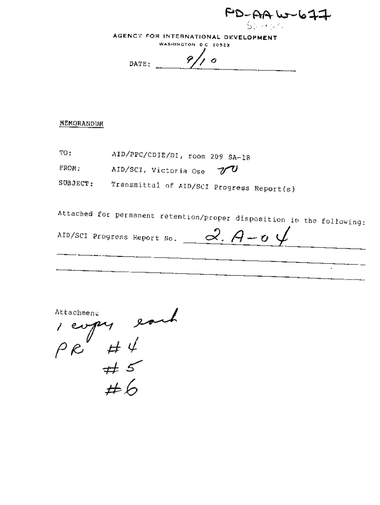 AGENCY INTERNATIONAL DEVELOPMENT WASHINGTON.DATE:E0 C:_20523___MEMORANDUM TO:AID/PPC/DIE/DI, room 209 SA18FROM:AID/SCI, Victoria Subject:Transmittal of AID/SCI Progress Report(s)Attached for permanent