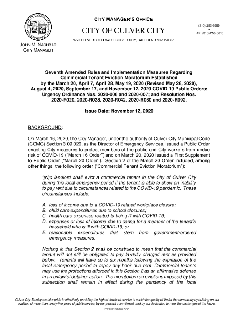 CITY MANAGERS OFFICECITY OF CULVER CITY(310) 2536000 FAX (310) 25360109770 CULVER BOULEVARD, CULVER CITY, CALIFORNIA 902320507JOHN M. NICOBAR CITY MANAGERSeventh Amended Rules and Implementation Measures