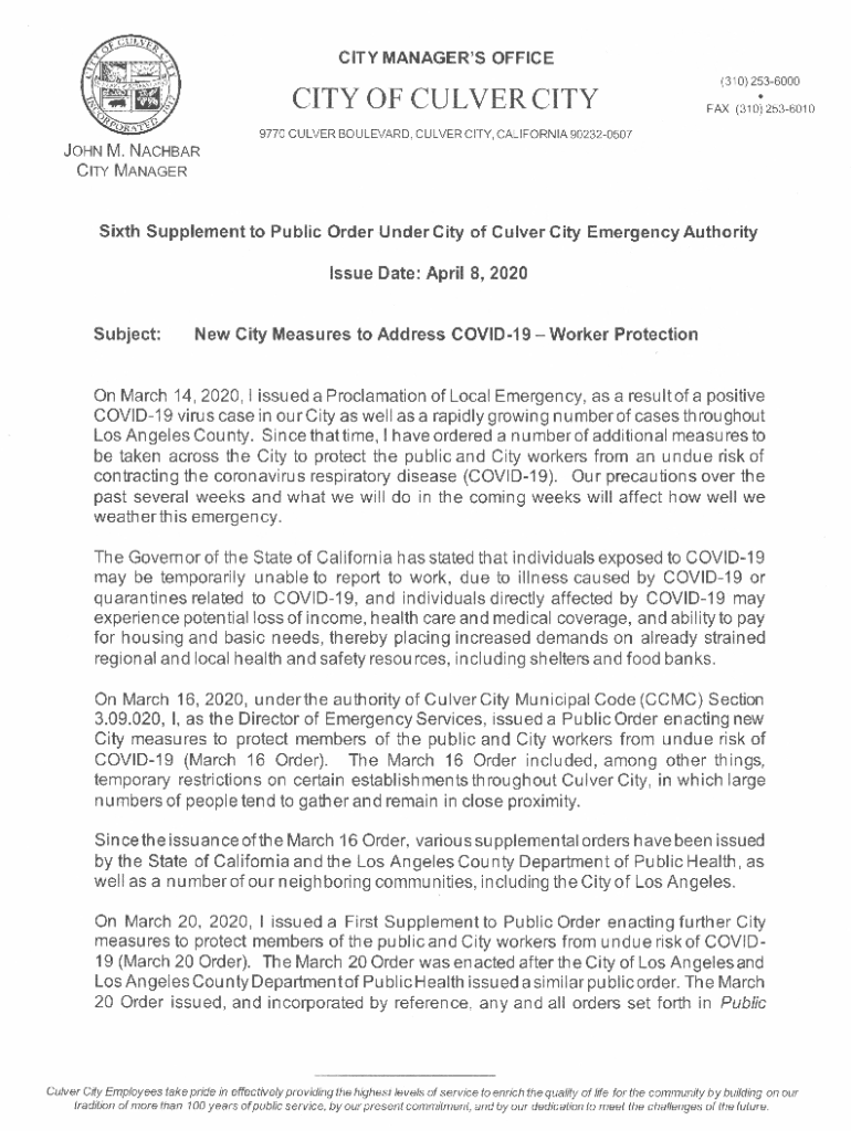 EXHIBIT Public Order Under City of Los Angeles Emergency Authority Issue Date: April 7, 2020, Subject:Worker Protection Order March 19, 2020, I issued a Safer At Home Order for the City of Los Angeles