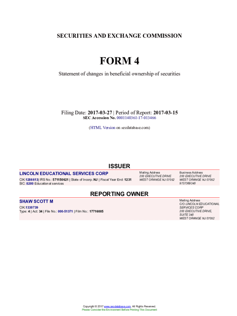 Get the free LINCOLN EDUCATIONAL SERVICES CORP Form 4 Filed 2017-03-27. Accession Number