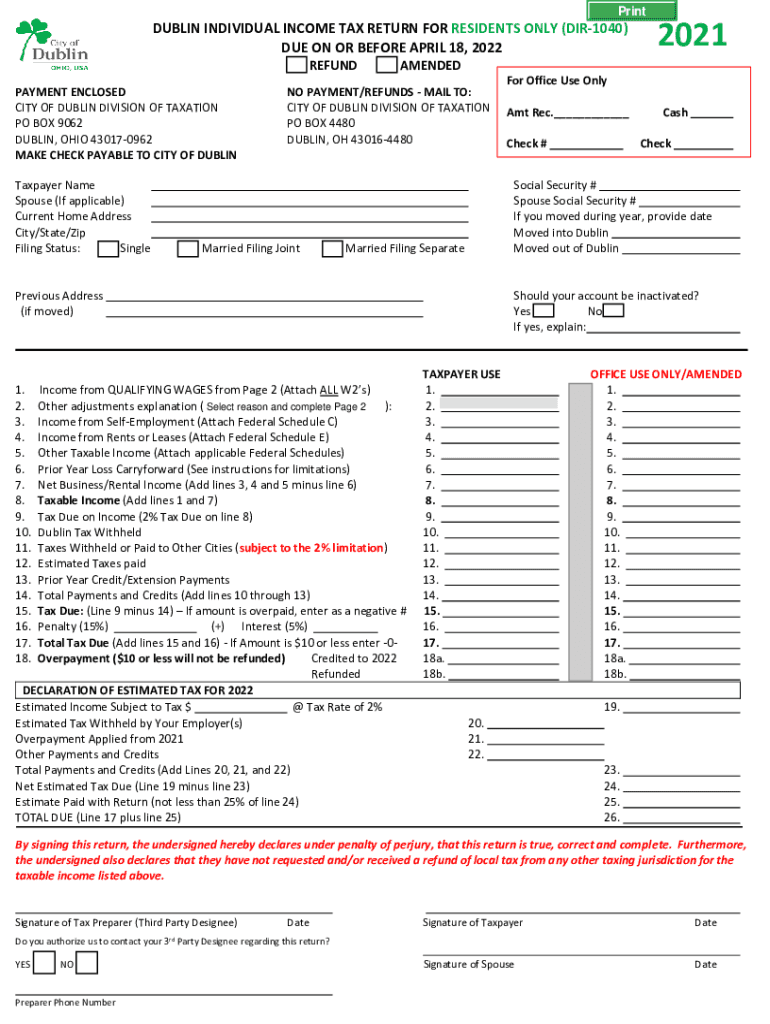 Reset FormPrintDUBLIN INDIVIDUAL INCOME TAX RETURN FOR RESIDENTS ONLY (DIR1040) DUE ON OR BEFORE APRIL 18, 2022, REFUND PAYMENT ENCLOSED CITY OF DUBLIN DIVISION OF TAXATION PO BOX 9062 DUBLIN, OHIO