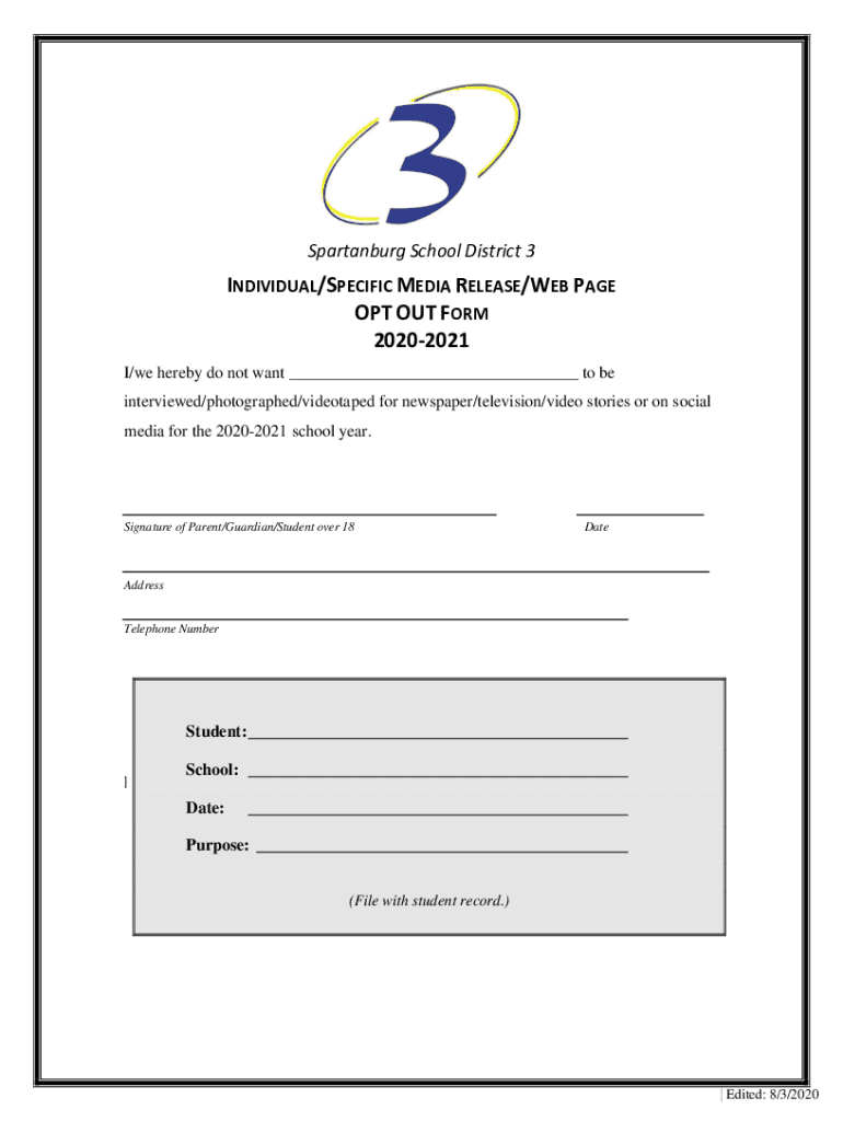 Spartanburg School District 3INDIVIDUAL/SPECIFIC MEDIA RELEASE/WEB PAGE OPT-OUT FORM 20202021 I/we hereby do not want ___ to be interviewed/photographed/videotaped for newspaper/television/video stories