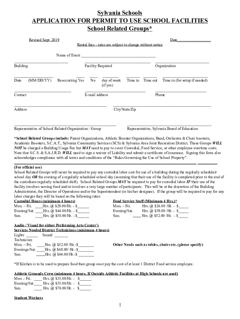 Sylvia Schools APPLICATION FOR PERMIT Using SCHOOL FACILITIES School Related Groups* Revised Sept. 2019Date___ Rental fees rates are subject to change without nickname of Event ____________BuildingFacility