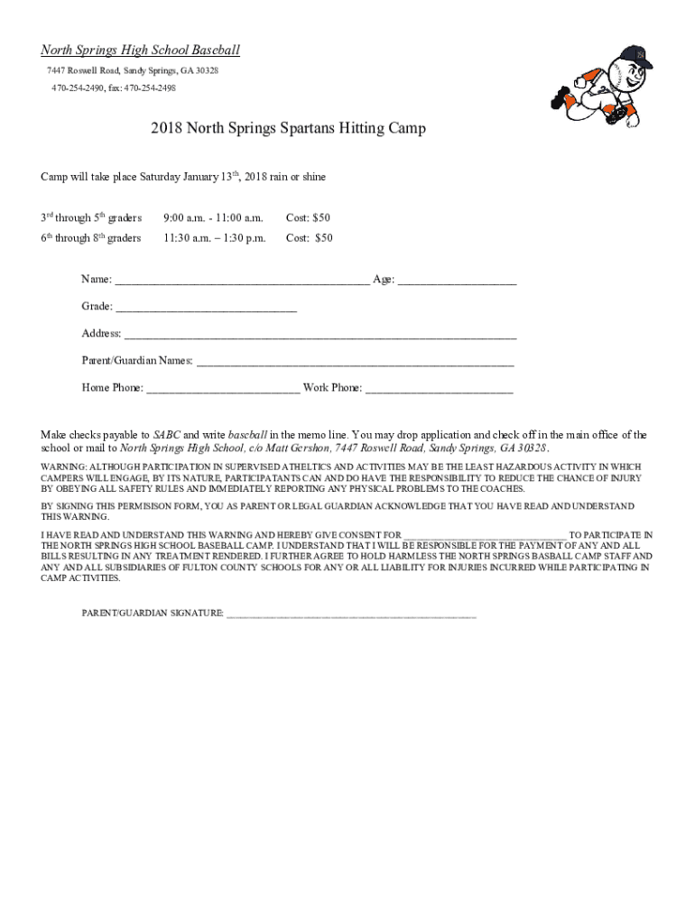 North Springs High School Baseball 7447 Roswell Road, Sandy Springs, GA 30328 4702542490, fax: 47025424982018 North Springs Spartans Hitting Camp will take place Saturday, January 13th, 2018 rain