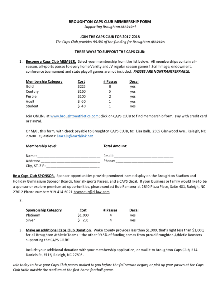 BROUGHT ON CAPS CLUB MEMBERSHIP FORM Supporting Brought on Athletics! JOIN THE CAPS CLUB FOR 20172018 The Caps Club provides 99.5% of the funding for Brought on Athletics THREE WAYS TO SUPPORT THE