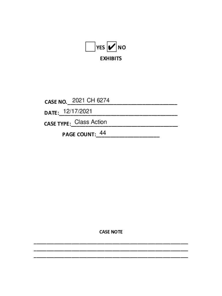 YES NOEXHIBITS2021 CH 6274 CASE NO.___12/17/2021 DATE:___ Class Action CASE TYPE:___44-PAGE COUNT:___CASE NOTE ___ ___ ___FILED DATE: 12/17/2021 10:25 AM 2021CH06274Hearing Date: 4/18/2022 10:00 AM