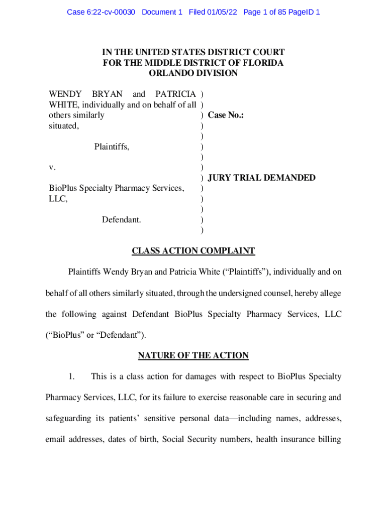 Case 6:22cv00030 Document 1 Filed 01/05/22-Page 1 of 85 Paged 1IN THE UNITED STATES DISTRICT COURT FOR THE MIDDLE DISTRICT OF FLORIDA ORLANDO DIVISION WENDY BRYAN and PATRICIA WHITE, individually