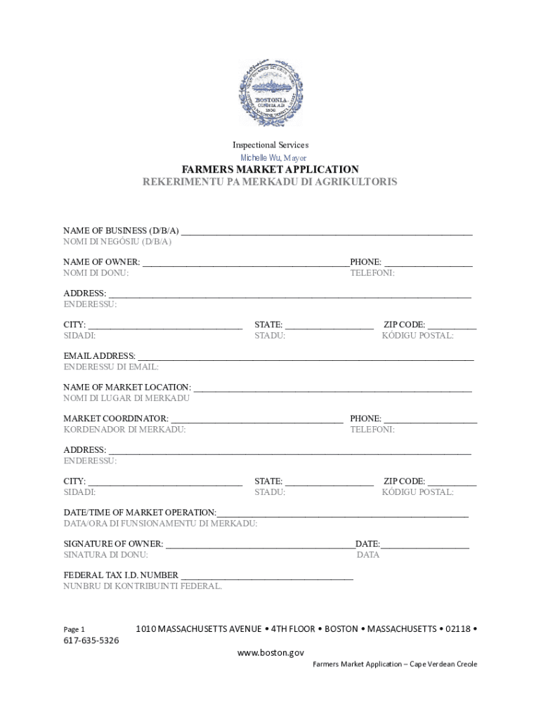 Inspection Services Michelle Wu, MayorFARMERS MARKET APPLICATION REKERIMENTU PA MERCADO DI AGRIKULTORISNAME OF BUSINESS (D/B/A) ___ NAOMI DI NESSIE (D/B/A) NAME OF OWNER: ___PHONE: ___ NAOMI DID ONU: